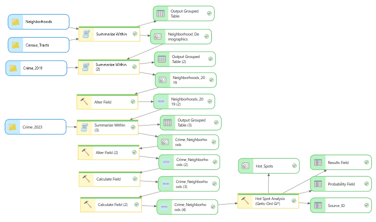 - Add a second Summarize Within tool to your diagram to perform a spatial join to get neighborhood crime counts for 2023.