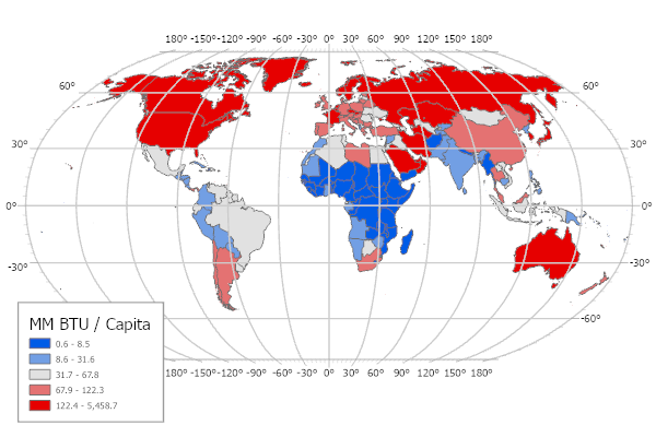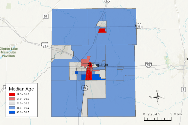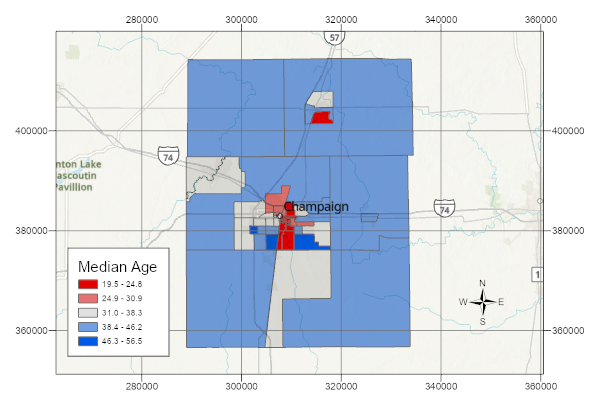 In the example choropleth above, the legend associates ranges of percents of Democratic voters in the 2012 election with specific colors. The colors range from red (low percentages of Democratic voters = high percentages of Republican voters) to blue (high percentages of Democratic voters).