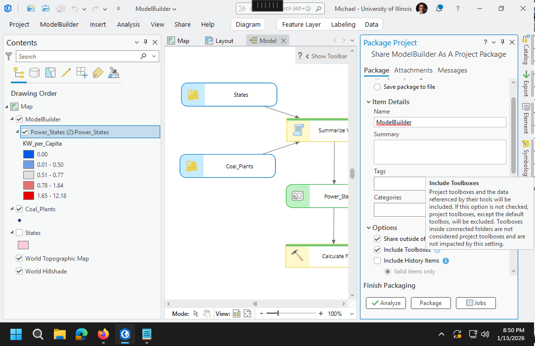 If the Include Toolboxes option is not checked. the ModelBuilder toolbox (and its database) are not included in the project, share outside organization cannot include all feature classes used in project maps, and the packaging fails.