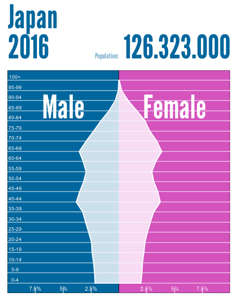 At the opposite end of the demographic transition is Japan, a highly-industrialized, technologically-advanced country with very low birth rates and declining population. In contrast to the labor surpluses of countries like Nigeria, Japan, and many other developed countries like it, are beginning to face labor shortages and economic stagnation, and will struggle to support and care for their growing cohort of elderly residents. The elevated-and growing dependency ratio of 64 reflects this increasing challenge to Japanese society.